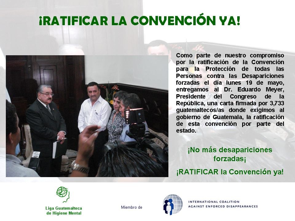 Guatemala - Liga Guatemalteca de Higiene Mental, member of ICAED, on May 19th offered 3,733 signatures to the President of the Congress of Guatemala, Dr. Eduardo Meyer, demanding swift ratification of the Convention by the Government of Guatemala.