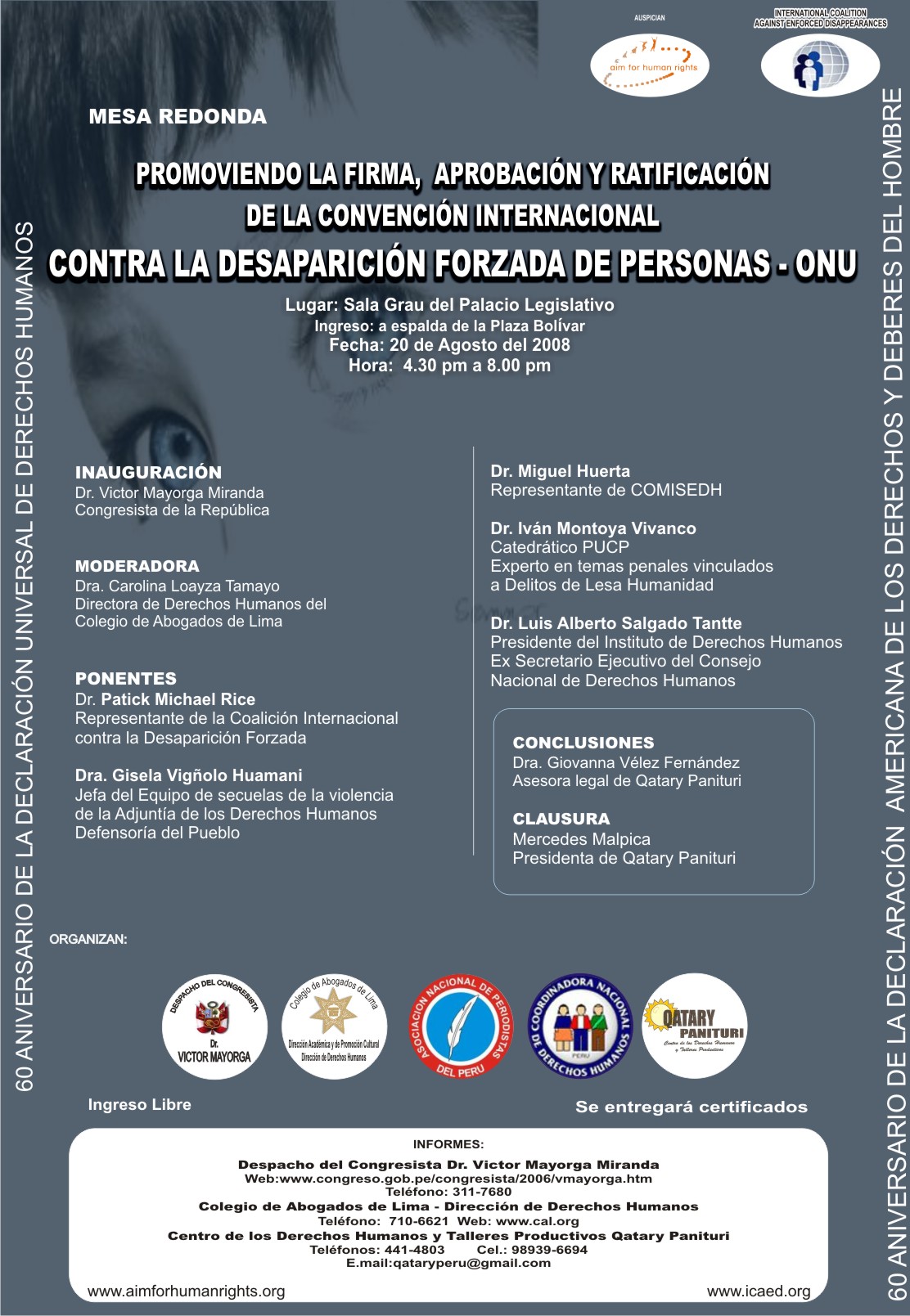 Peru - on August 20, Qatary Panituri organises a seminar to promote the UN Convention against enforced disappearances in Lima, Peru. Dr. Patrick Rice will be speaking on behalf of the Coalition. For more information, see the seminar poster and the Qatary Panituri blogsite (both in Spanish).