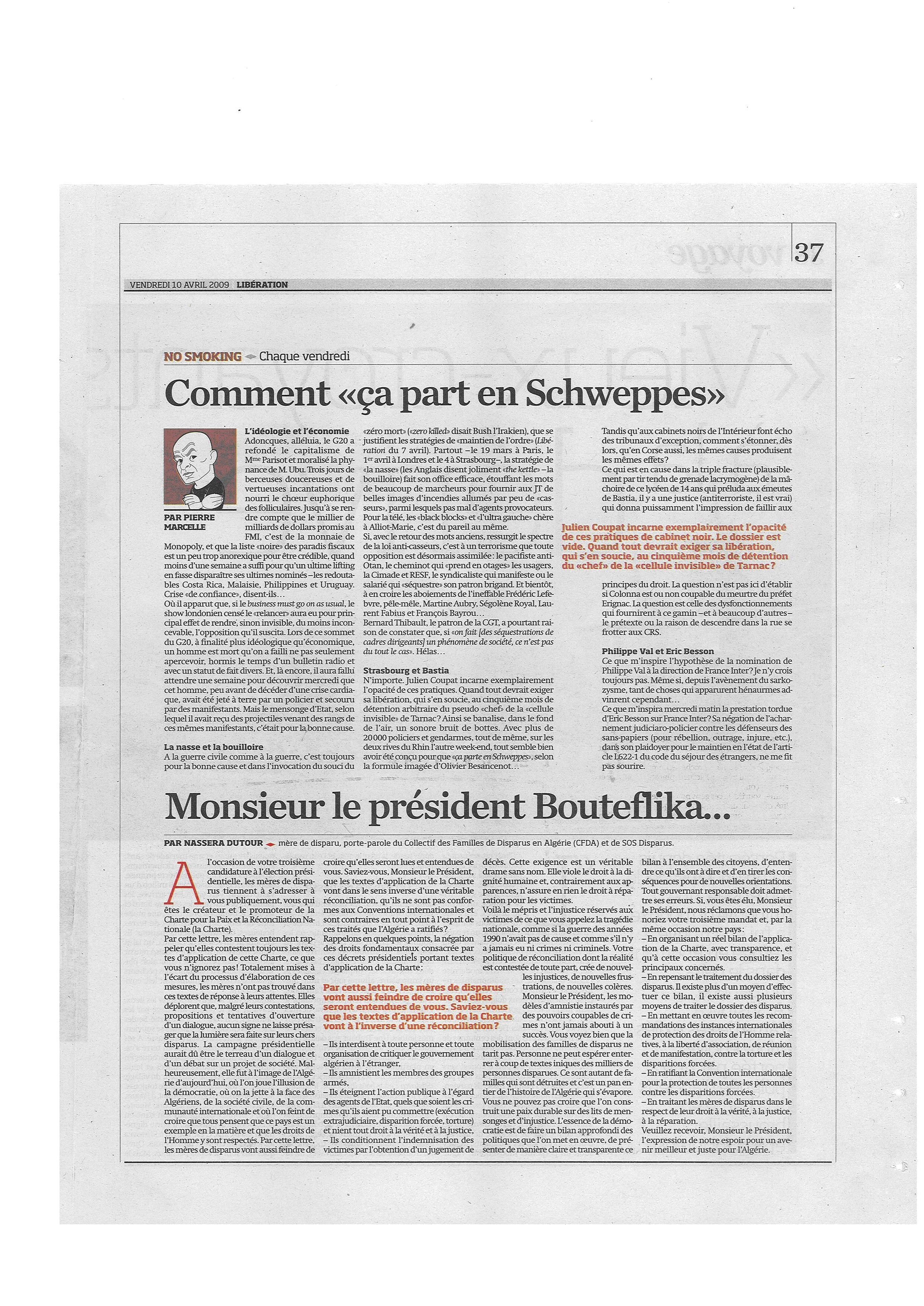 Algeria - On April 10, 2009, Nassera Dutour (mother of a disappeared person and spokesperson of CFDA and SOS-Disparu) sent a letter to the president of Algeria reminding him of his repsonsibilities. it mentions the plight of the mothers of the disappeared as well as the appeal to ratify the Convention. Read the newspaper article (in .jpg)